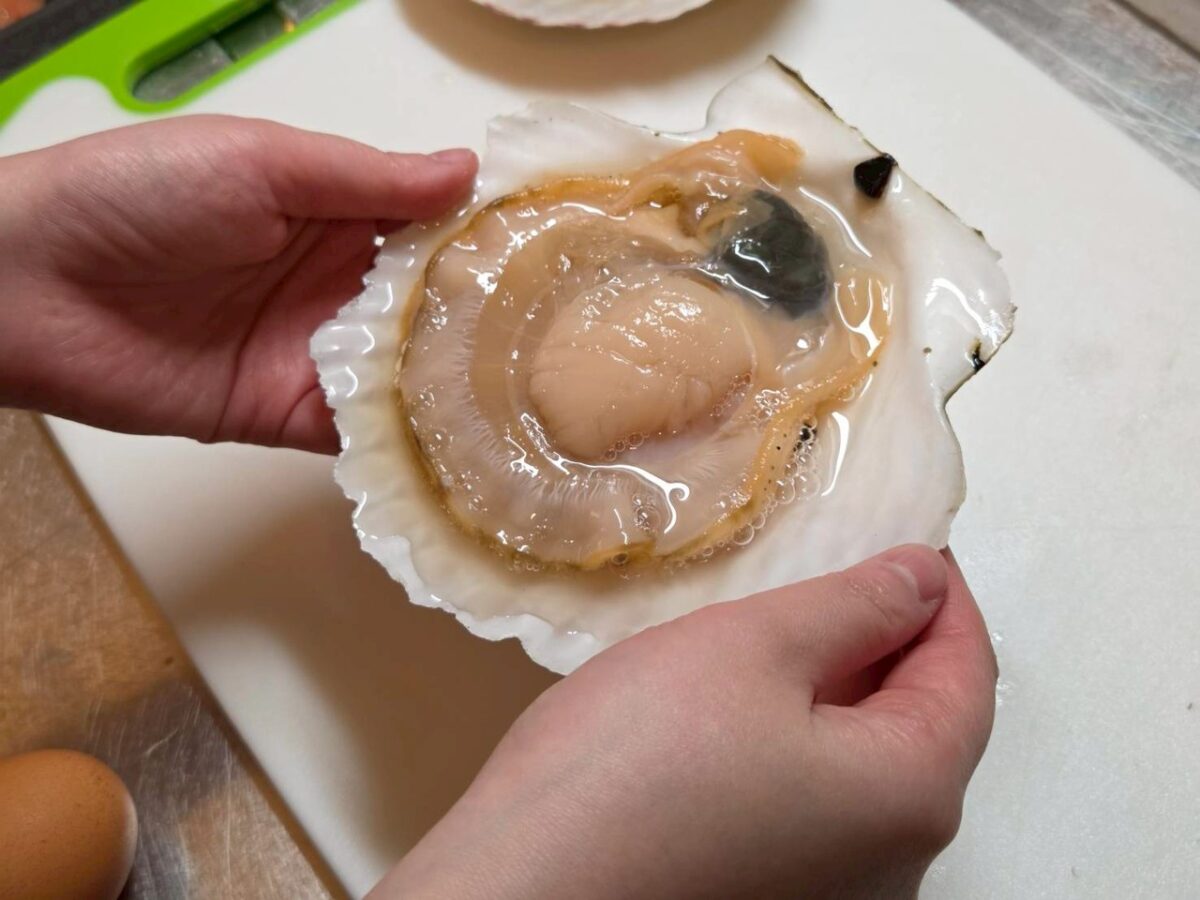 貝柱とひもを一度外し、黒い部分を取り除きます。塩水で軽くぬめりを取ってから、再び殻に戻して焼くと香りがよりよく、美味しく仕上がります。
